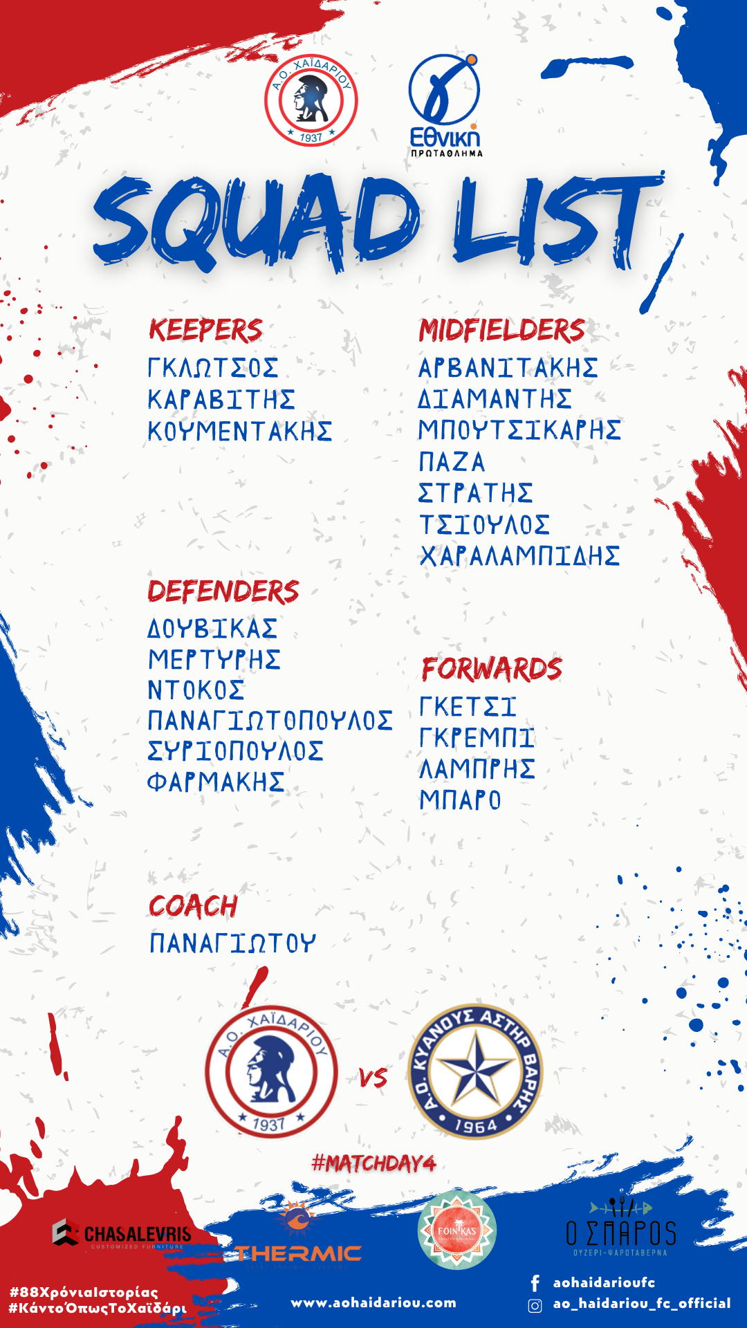 Μετά το τέλος της σημερινής πρωινής προπόνησης, ο προπονητής μας Μάριος Παναγιώτου, ανακοίνωσε την αποστολή της ομάδας μας για το εντός έδρας ματς απέναντι στον Αστέρα Βάρης, στα πλαίσια της 4ης αγωνιστικής. Εκτός αποστολής έμειναν ο τραυματίας Γωγουβίτης, καθώς και ο τιμωρημένος Ικεότσα. Οι Γιαννόπουλος, Κονδύλης και Φακατσέλης θα ενισχύσουν το Χαϊδάρι Β’ στο γειτονικό ντέρμπι απέναντι στον Ζέφυρο Αιγάλεω.