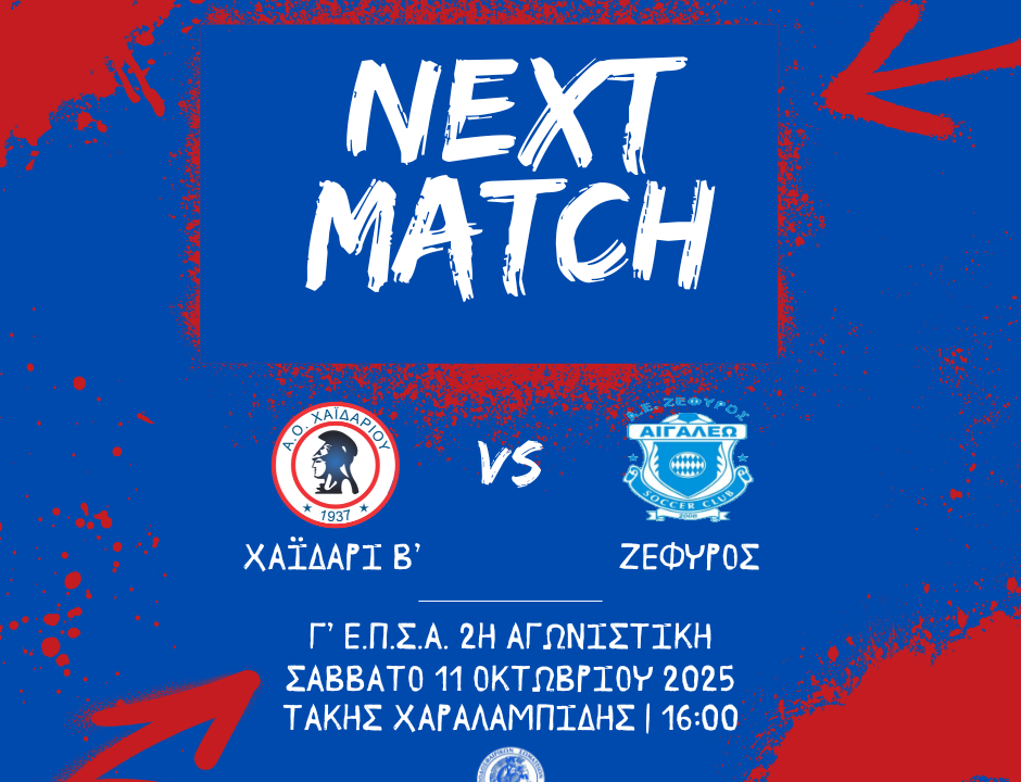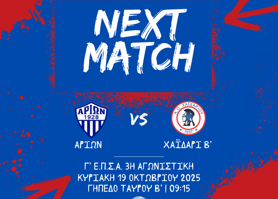 Εκτός έδρας αναμέτρηση για τους νεαρούς ποδοσφαιριστές μας για το πρωτάθλημα της Γ’ Ε.Π.Σ.Α., με το Χαϊδάρι Β’ να φιλοξενείται από τον Αρίων. Κυριακή 19 Οκτωβρίου στις 09:15, στο γήπεδο Ταύρου Β’. Καλή επιτυχία στην ομάδα μας!