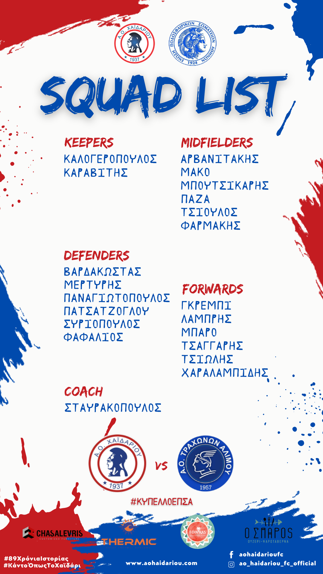 Μετά το τέλος της σημερινής απογευματινής προπόνησης, ο προπονητής μας Βαγγέλης Σταυρακόπουλος, ανακοίνωσε την αποστολή της ομάδας μας για το εντός έδρας ματς απέναντι στους Τράχωνες, στα πλαίσια της ημιτελικής φάσης του Κυπέλλου Ε.Π.Σ.Α. της σεζόν 2025 – 2026.
