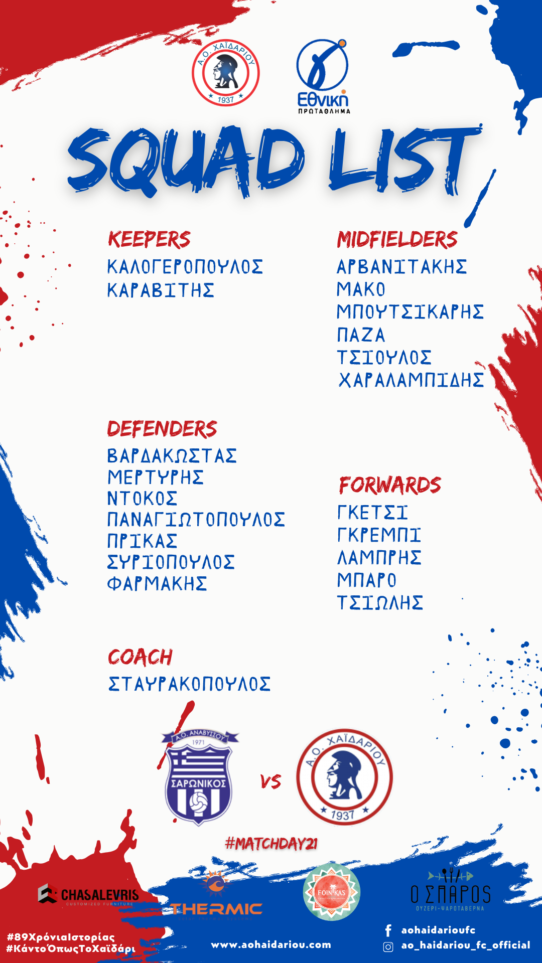 Μετά το τέλος της σημερινής απογευματινής προπόνησης, ο προπονητής μας Βαγγέλης Σταυρακόπουλος, ανακοίνωσε την αποστολή της ομάδας μας για το εκτός έδρας ματς απέναντι στο Σαρωνικό Αναβύσσου, στα πλαίσια της 21ης αγωνιστικής. Εκτός αποστολής έμειναν οι τραυματίες Γωγουβίτης, Γκλώτσος, Τσαγγάρης και Πατσατζόγλου.