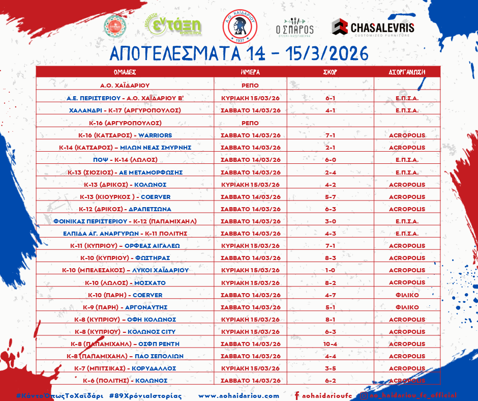 16 Μαρτίου 2026 Κατηγορίες Νέα Ακαδημιών Ετικέτες Κοινοποίηση Σχετικές αναρτήσεις30 Μαρτίου 2026Αποτελέσματα Ακαδημίας 28 – 29 Μαρτίου 2026Δείτε περισσότερα27 Μαρτίου 2026Πρόγραμμα Ακαδημίας 28 – 29 Μαρτίου 2026Δείτε περισσότερα24 Μαρτίου 2026Αποτελέσματα Ακαδημίας 21 – 22 Μαρτίου 2026Δείτε περισσότερα19 Μαρτίου 2026Πρόγραμμα Ακαδημίας 21 – 22 Μαρτίου 2026Δείτε περισσότερα13 Μαρτίου 2026Πρόγραμμα Ακαδημίας 14 – 15 Μαρτίου 2026Δείτε περισσότερα