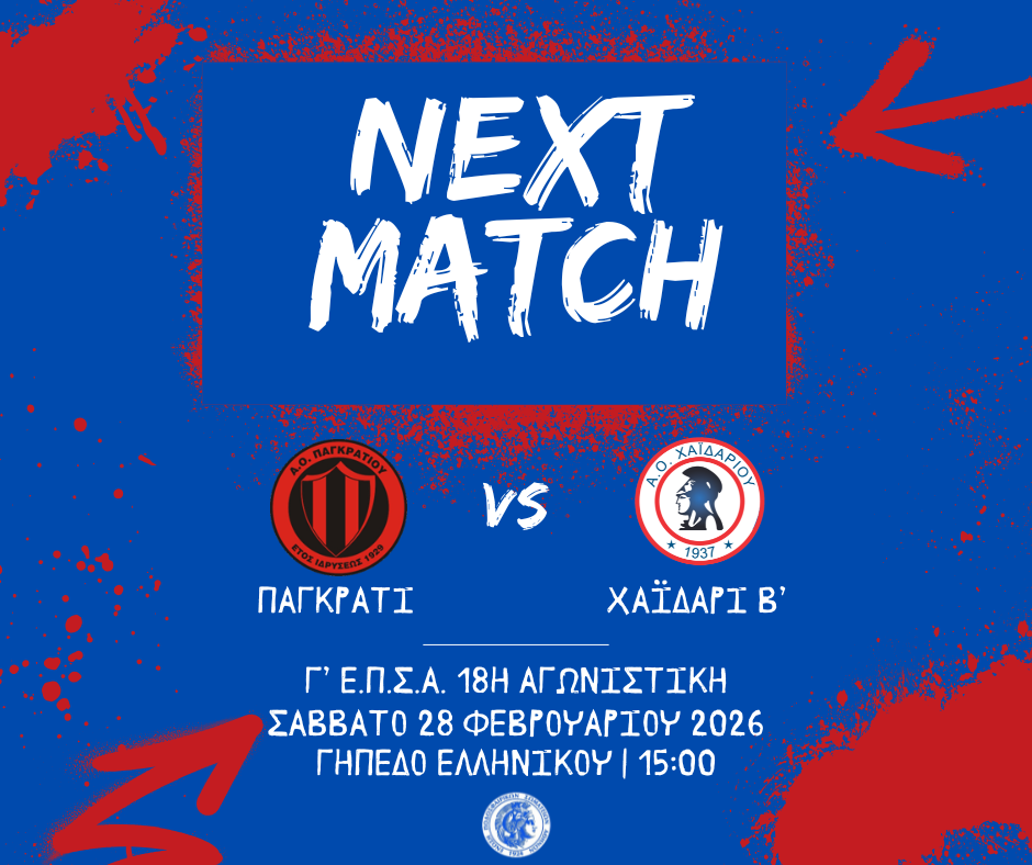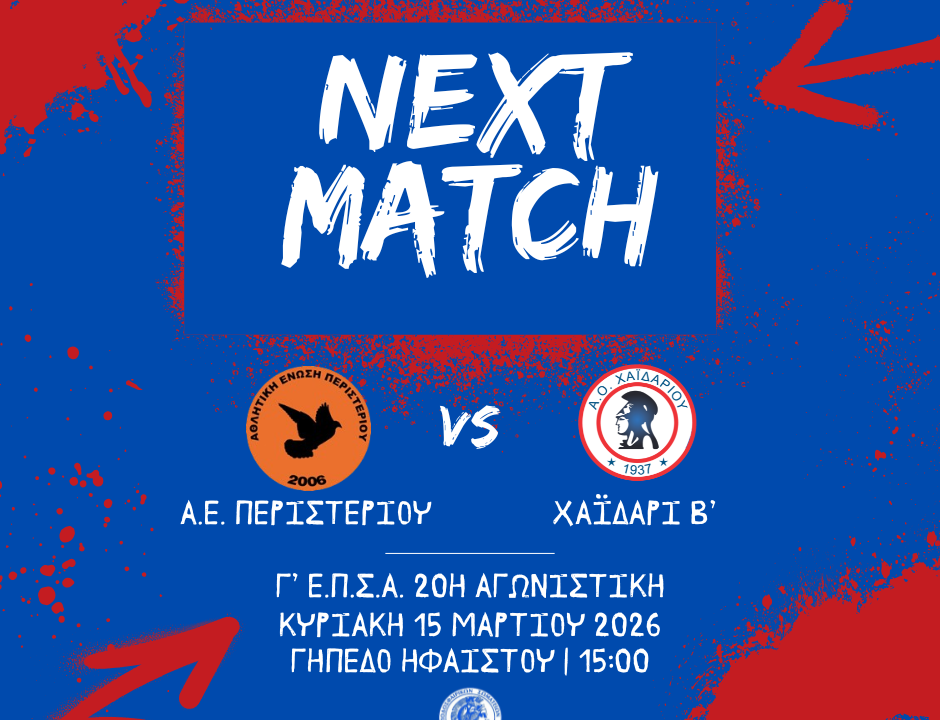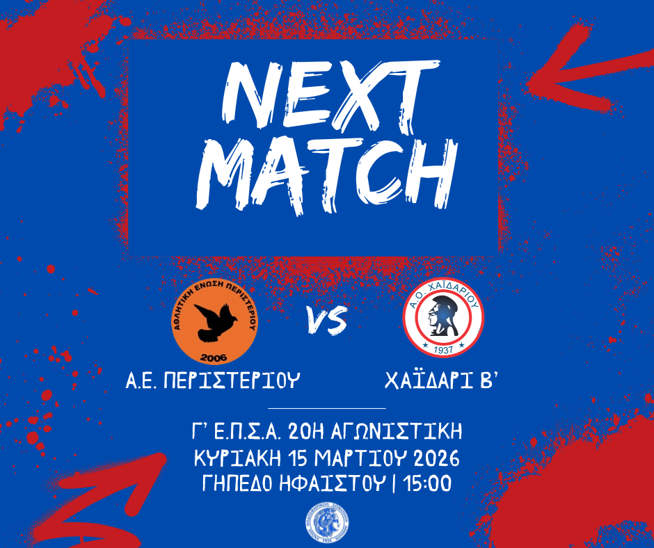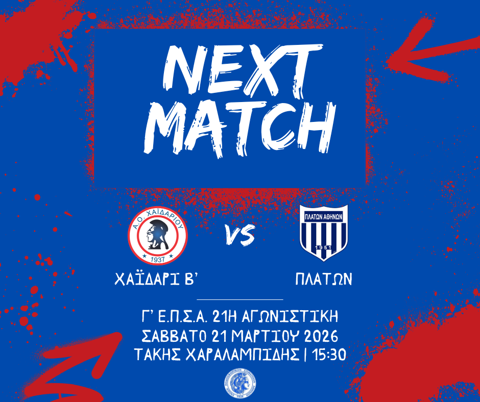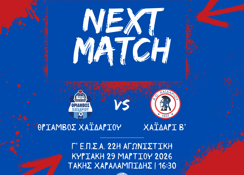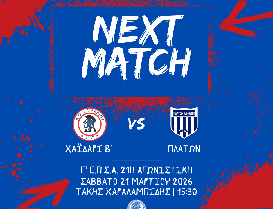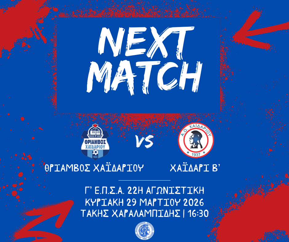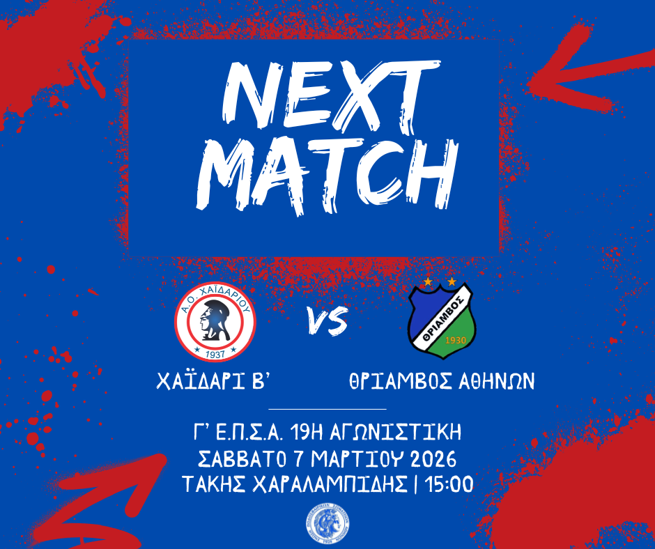 Τοπικό ντέρμπι για τους νεαρούς ποδοσφαιριστές μας για το πρωτάθλημα της Γ’ Ε.Π.Σ.Α., με το Χαϊδάρι Β’ να φιλοξενείται από τον συμπολίτη Θρίαμβο Χαϊδαρίου. Κυριακή 29 Μαρτίου στις 16:30, στο “Τάκης Χαραλαμπίδης”. Καλή επιτυχία στην ομάδα μας!