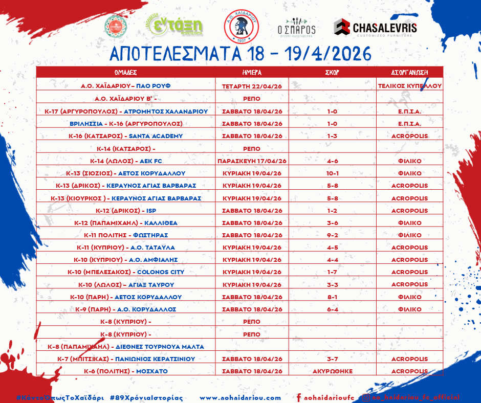 20 Απριλίου 2026 Κατηγορίες Νέα Ακαδημιών Ετικέτες Κοινοποίηση Σχετικές αναρτήσεις18 Απριλίου 2026Οδηγίες προς τους φιλάθλους μας για τον ΤελικόΔείτε περισσότερα16 Απριλίου 2026Πρόγραμμα Ακαδημίας 18 – 19 Απριλίου 2026Δείτε περισσότερα16 Απριλίου 2026Η Πόλη παίζει Τελικό!Δείτε περισσότερα30 Μαρτίου 2026Αποτελέσματα Ακαδημίας 28 – 29 Μαρτίου 2026Δείτε περισσότερα27 Μαρτίου 2026Πρόγραμμα Ακαδημίας 28 – 29 Μαρτίου 2026Δείτε περισσότερα
